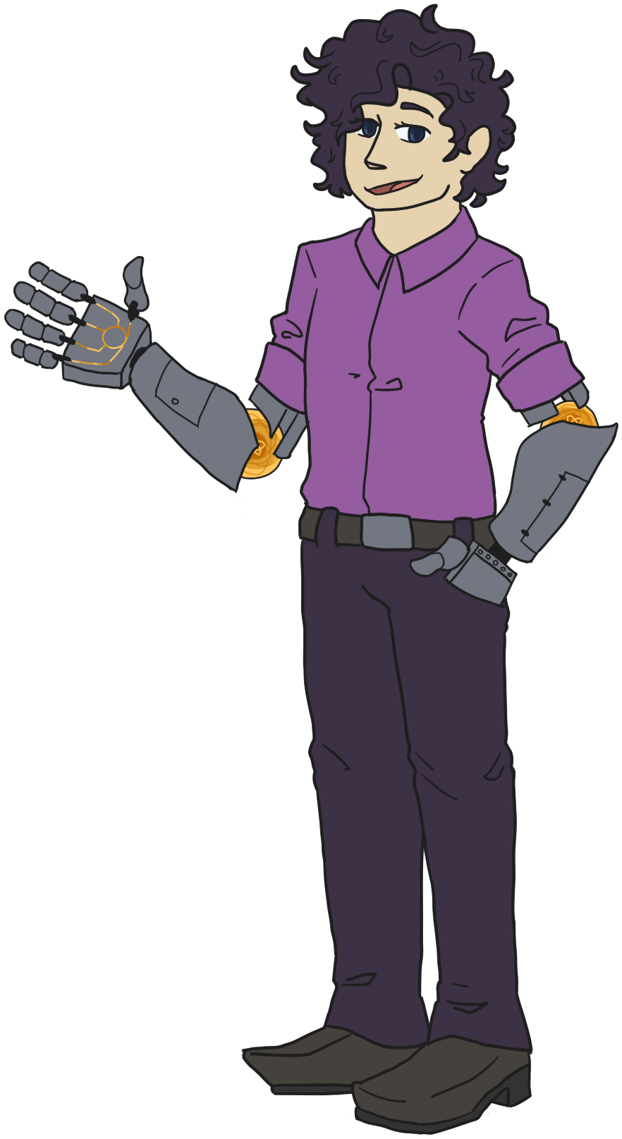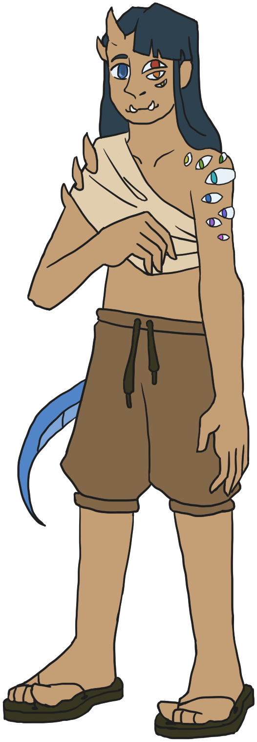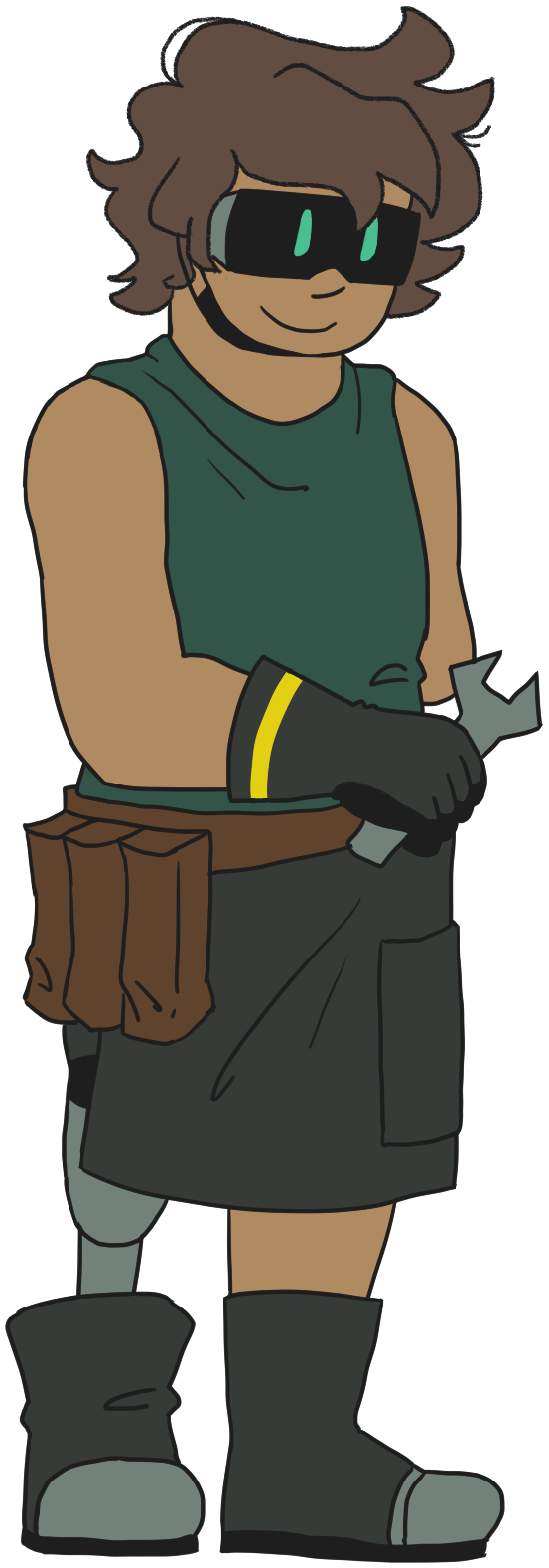 Tachyon is a mechanic and prosthetic designer who lives in Xeol. They have prosthetics of their own, but they mostly make the parts of them to be used and assembled by other people. They designed their visor with the help of Siras, a childhood friend of theirs. They also trusted him to install it for them, as it’s connected to their occipital lobe. They visit the caverns of Decord with Siras every few years. They have not become very well acquainted with and of the vorkim locals, but they do greatly enjoy talking to them and learning about the enbrem and the methods they use to extract the material. They prefer to buy the enbrem they use directly from the vorkim every couple of years, and like taking a couple weeks off to visit and restock.